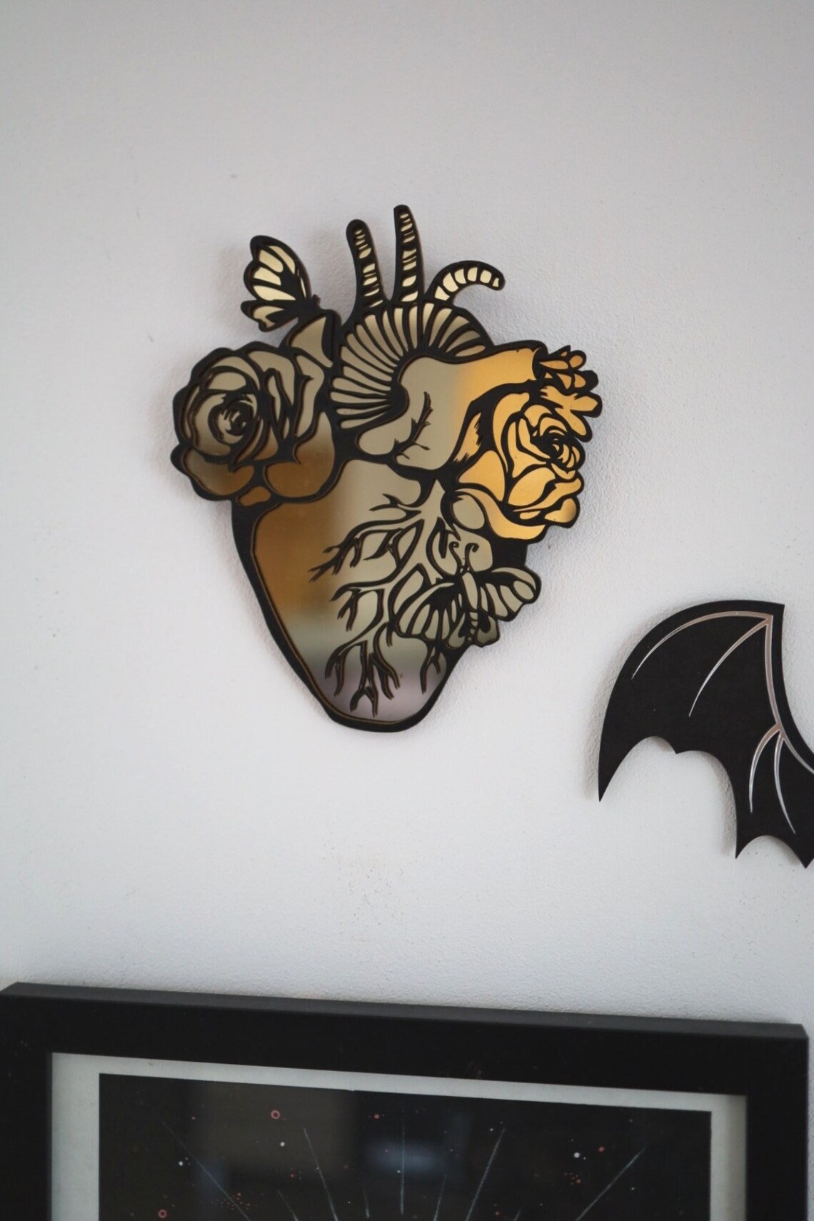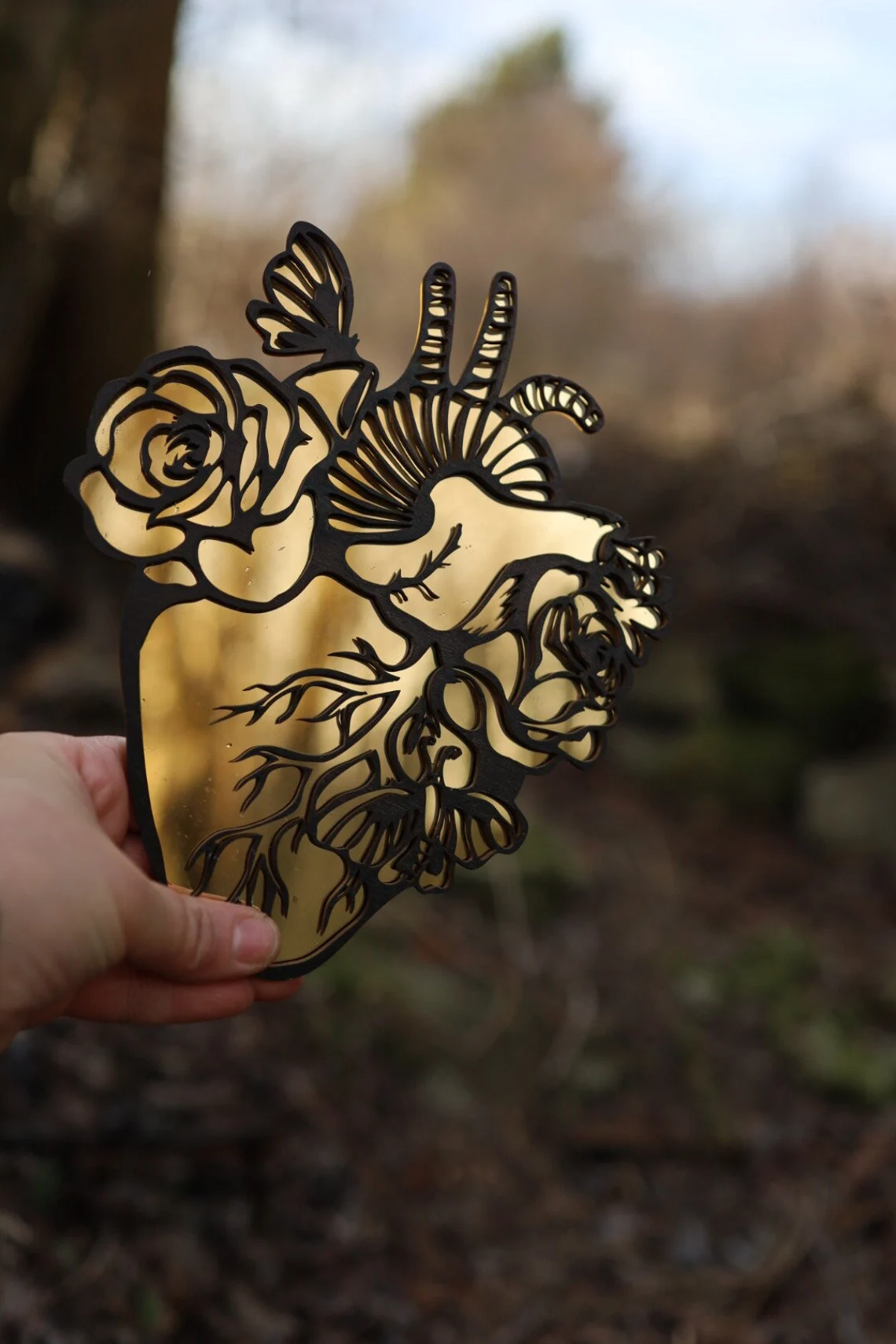 Anatomiczne, ażurowe serce z kwiatami i motylami.